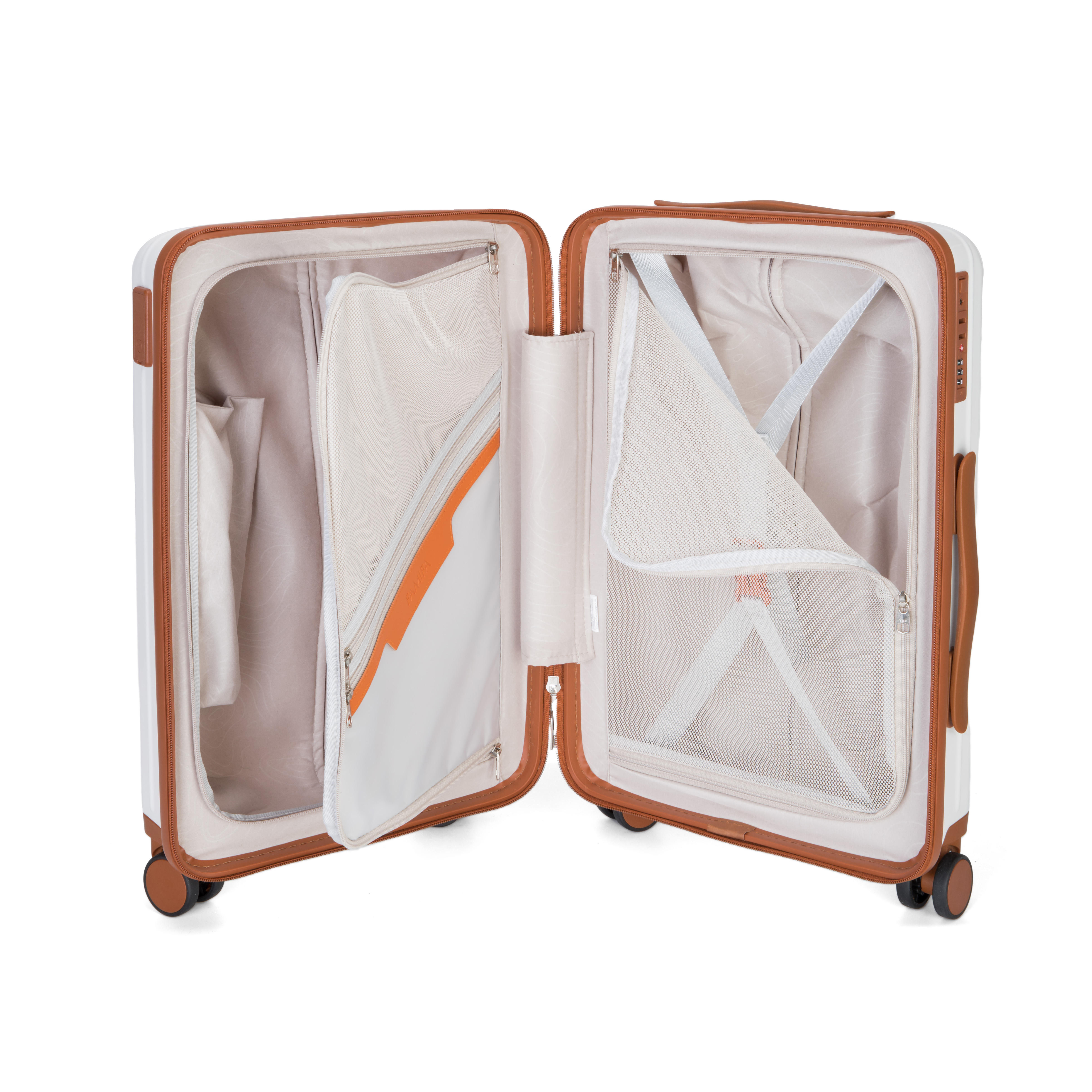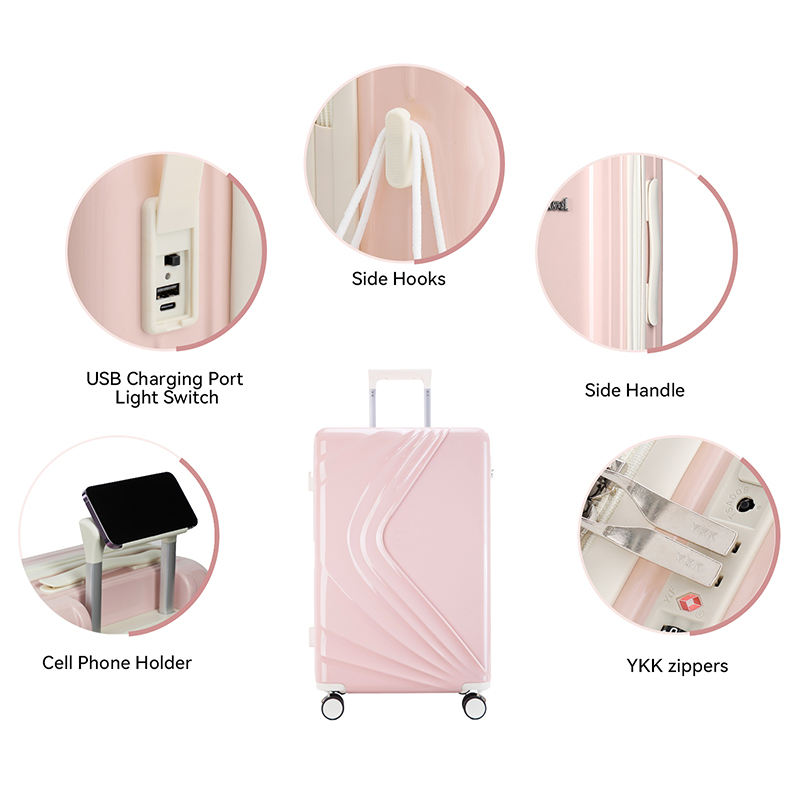 | ABS+PC | 20″24″28″ | Aluminum trolley | spinner double silent wheel*4 | Soft rubber handle*2 | White, Blue, Pink |